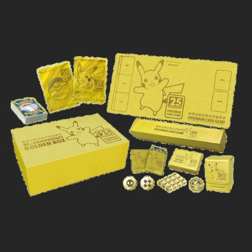 The Pokémon 25th Anniversary Collection Golden Box is packed full of essential cards and collectibles for any Pokémon trainer, fan, and collectors alike. Inside of the Pokémon 25th Anniversary Collection Golden Box you will find a gold Pokéball card, a gold Pikachu V card, a 60 card deck made up of exclusively holos, 64 premium gloss card sleeves, a foil stamped rubber playmat, metal dice, metal condition markers, a synthetic leather deck case, a synthetic leather playmat case, a synthetic leather dice case, a Pokémon coin, and five Pokémon 25th Anniversary booster packs.